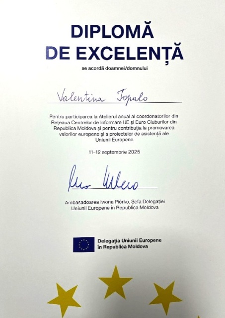 Delegația Uniunii Europene în Republica Moldova a acordat Diploma de excelență și Certificatul de calificare doamnei Valentina TOPALO