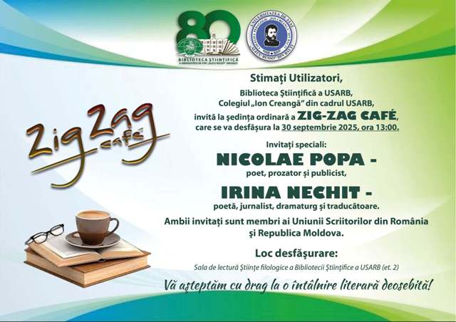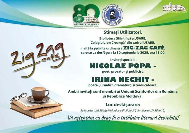 Biblioteca Ştiinţifică a USARB, Colegiul Pedagogic „Ion Creangă” din cadrul Universităţii de Stat „Alecu Russo” din Bălţi, invită elevii şi profesorii Colegiului la şedinţa ordinară a ZIG-ZAG CAFÉ, care va avea loc la 30 septembrie 2025, ora 13:00.
